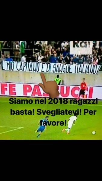 Striscione razzista comparso ieri durante l’amichevole fra Italia e Arabia Saudita rivolto a Balotelli, che era designato come vice-capitano della nazionale. Pronta la replica su Instagram dell’attaccante azzurro: “Siamo nel 2018 ragazzi, basta! Svegliatevi! Per favore!”