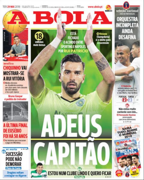 AGGIORNAMENTO DAL PORTOGALLO – L’indizio eloquente riguardante Rui Patricio arriva proprio dal Portogallo, con la prima pagina del quotidiano A Bola che titola: “Addio Capitano” con la foto del portiere. Segno che, probabilmente, la trattativa per il passaggio del portiere portoghese al Napoli è in fase avanzata.