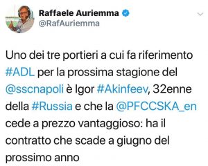 Con un tweet sul proprio account ufficiale, Raffaele Auriemma ha annunciato che uno dei tre portieri a cui ha fatto riferimento ieri De Laurentiis potrebbe essere Igor Akinfeev del CSKA Mosca.