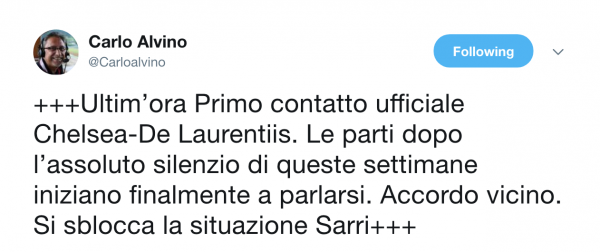 AGGIORNAMENTO ORE 17.16 – Secondo quanto riferisce il giornalista di TV Luna Carlo Alvino su Twitter, sarebbe di pochi minuti fa il primo contatto ufficiale tra il Chelsea e il presidente De Laurentiis per cercare di sbloccare la vicenda legata al contratto di Maurizio Sarri. L’accordo sarebbe ormai vicino con il tecnico che finalmente potrebbe trasferirsi a Londra.