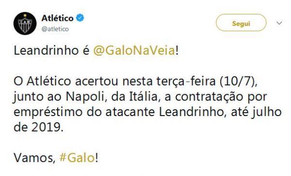 A confermato è un tweet della società: “Leandrinho è dei nostri! L’Atletico ha raggiunto nella giornata di oggi, 10 luglio, l’accordo con il Napoli, per il prestito dell’attaccante fino a luglio 2019!”