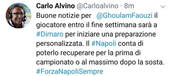 “Buone notizie per Ghoulam! Il giocatore entro fine settimana sarà a Dimaro per iniziare una preparazione personalizzata. Il Napoli conta di poterlo recuperare per la prima di campionato o al massimo dopo la sosta. ForzaNapoliSempre”.