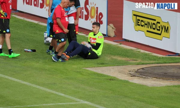 Al nuovo portiere del Napoli è stato immediatamente apposto del giaccio sul polso ed è stato costretto ad uscire dal campo, mentre il suo posto in allenamento è stato preso da Karnezis.