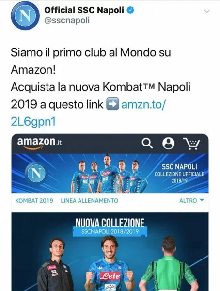 Ma non è finita qui: il Napoli sbarca anche su Amazon. Il club di De Laurentiis sarà il primo a lanciare il proprio brand contemporaneamente su Amazon.it, Amazon.co.uk, Amazon.fr, Amazon.es, Amazon.de.