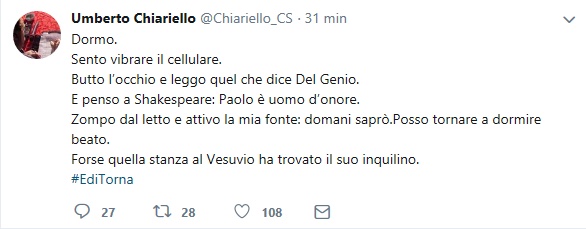 Tre anni dopo ad infiammare il mercato azzurro è sempre Edinson Cavani: ma poche voci pian piano si stanno trasformando in un coro e la bomba di Paolo Del Genio di questa sera (CLICCA QUI) ha tolto il sonno a molti. Anche ad Umberto Chiariello, collega di Canale 21 che, letta l’indiscrezione di Del Genio, ha subito voluto dire la sua su Twitter, col post che potete leggere qui in basso. Con una chiusura che sa di speranza, che parla di un sogno che finalmente può diventare, può tornare realtà: chissà che quella stanza al Vesuvio non abbia ritrovato il suo inquilino…
