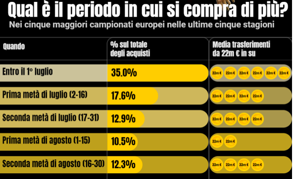 E CAVANI? – Da Caivano a Cavani, insomma. Ma il Matador non avrebbe intenzione di muoversi. Nonostante la psicosi scatenata nelle ultime ore, l’ex mai dimenticato avrebbe fatto sapere di voler restare al Paris Saint Germain e di voler continuare a vincere con la maglia dei campioni di Francia. Tutto secondo copione, così come la risposta di De Laurentiis: “Cavani guadagna troppo, tutto potrebbe cambiare se fosse lui ad alzare il telefono”, le parole del presidente. Che nel frattempo si gode Ancelotti e l’ultimo step del mercato, prima di consegnare l’ultima bozza di squadra al proprio allenatore. Non manca nulla, o forse tutto, ma come dimostra la grafica realizzato da sports.bwin.it, la fase calda del mercato si esaurisce tra fine giugno e inizio luglio.