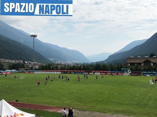 Terminato l’allenamento mattutino a Dimaro. Ad inizio sessione la squadra di Carlo Ancelotti si è dedicata al lavoro aerobico per prepararsi alla partitella a campo ridotto. Solito lavoro di possesso palla in pressing e allenamento difesa contro attacco. Il mister del Napoli ha messo i due registi, Hamsik e Diawara, ad impostare con schema con palla allargata sulla fascia e cross al centro.