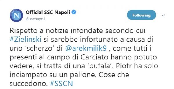 Il club partenopeo, inoltre, ci tiene a precisare che l’infortunio è stato del tutto fortuito e che sono infondate le voci che volevano il coinvolgimento, seppur fortuito, di Arek Milik nella dinamica dell’incidente.