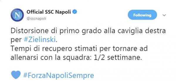 AGGIORNAMENTO ORE 20.00 – Arrivano buone notizie circa l’infortunio di Piotr Zielinski. Infatti secondo quanto comunicato dalla SSC Napoli attraverso il proprio account Twitter, il polacco ha subito una distorsione di primo grado alla caviglia destra e dovrà restare fermo circa 1-2 settimane, meno di quanto inizialmente previsto.