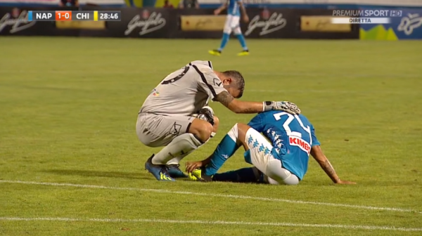 Proprio il napoletano, Lorenzo Insigne, è stato costretto a lasciare il campo al minuto 30 dellla prima frazione di gioco. Steso due volte dal terzino serbo Tanasijevic, non riesce a reggere l’urto: dà forfait per un problema al piede. Esce, zoppicante, lasciando il posto ad Adam Ounas.