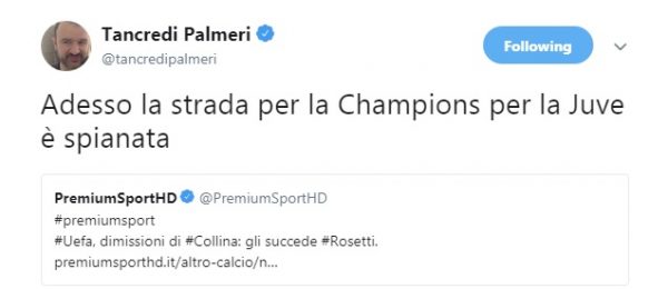 La notizia è stata commentata anche sul web, con il giornalista di Bein Sport, Tancredi Palmeri, che su Twitter ha rilasciato un commento che sa di ironia nei confronti della Juventus: “Adesso la strada per la Champions per la Juve è spianata“.