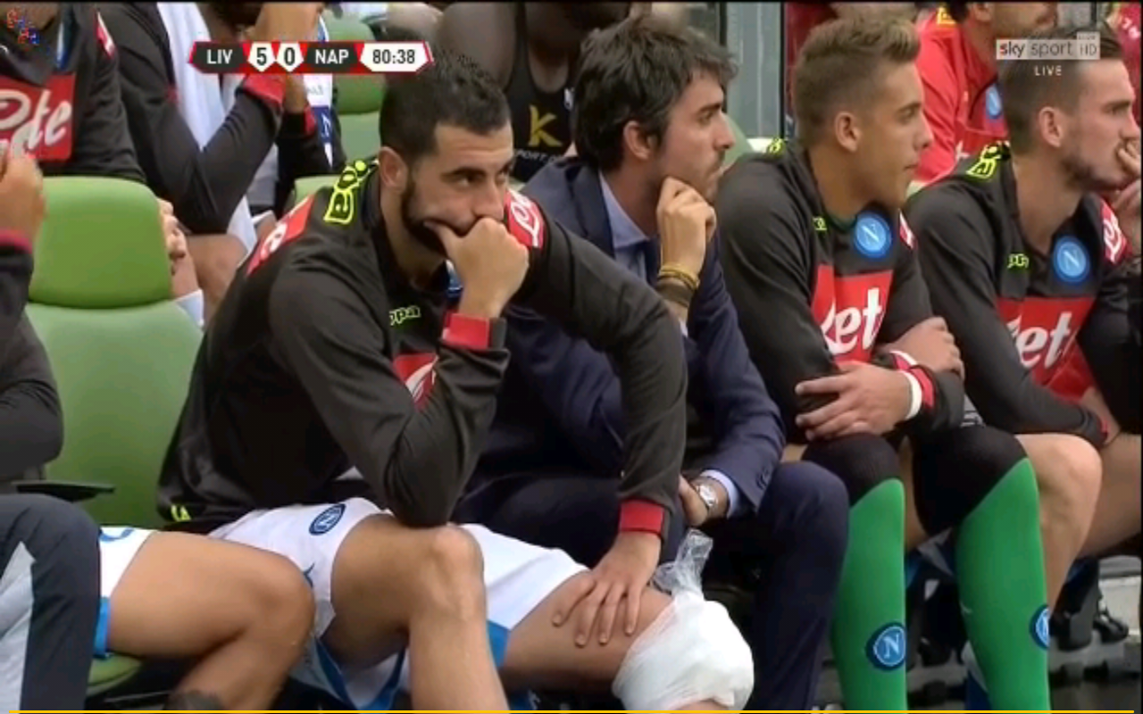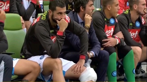 Appena arrivato in panchina il difensore spagnolo ha ricevuto le cure mediche dello staff azzurro per una brutta botta ricevuta al ginocchio sinistro, prontamente fasciata con il ghiaccio.