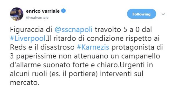 Sono molti coloro che sui social stanno giudicando il match, tra questi c’è anche il giornalista Enrico Varriale che su Twitter non è stato affatto tenero con i partenopei: “Figuraccia di @sscnapoli travolto 5 a 0 dal #Liverpool.Il ritardo di condizione rispetto ai Reds e il disastroso #Karnezis protagonista di 3 paperissime non attenuano un campanello d’allarme suonato forte e chiaro.Urgenti in alcuni ruoli (es. il portiere) interventi sul mercato“.