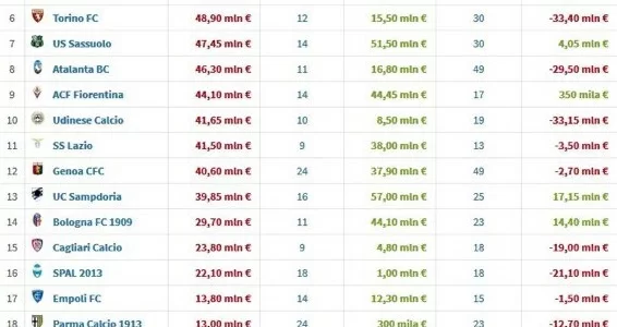 Tra i club che hanno speso meno c’è il Frosinone (appena 5,8 milioni), Chievo (10,3 milioni) e Parma che, nonostante un ottimo mercato, ha sborsato appena 13 milioni operando però con tanti prestiti (ben 4 arrivati dal Napoli).