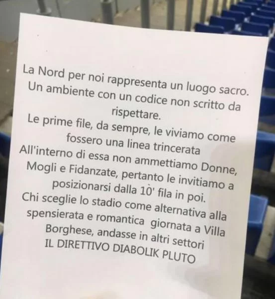 Tra le 12 righe si può leggere l’imposizione da parte di un gruppo di tifosi, che prevedeva l’esclusione delle donne dalle prime 10 file di quel settore. Dopo questa vicenda non poteva non intervenire l’autorità competente: