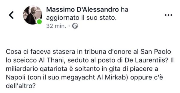 Il collega di Radio Marte, Massimo D’Alessandro, tramite il suo account Facebook svela un’indiscrezione che ai più è passata inosservata, la presenza dello sceicco qatariota Al Thani allo stadio San Paolo. Ecco quanto scritto da D’Alessandro e ripreso per i suoi lettori da Spazio Napoli: