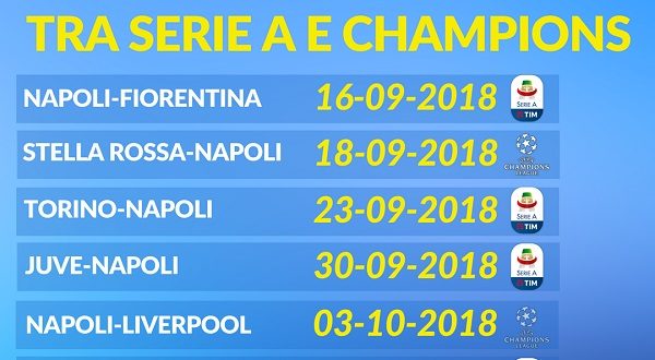 Particolarmente impegnativa la settimana che va dal 30 settembre al 7 ottobre con il Napoli che se la vedrà prima con la Juventus a Torino per la settima giornata di Serie A, e poi sarà impegnato pochi giorni dopo al San Paolo con il Liverpool in Champions. Da brividi anche il turno successivo con i partenopei che affronteranno prima il Psg in trasferta per la terza giornata di Champions League, e poi la Roma pochi giorni dopo che sarà ospite al San Paolo. Piccola curiosità: tutte le gare della fase a gironi del Napoli si giocheranno alle ore 21. Di seguito tutti gli incroci tra campionato e Champions League: