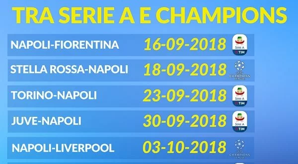 Particolarmente impegnativa la settimana che va dal 30 settembre al 7 ottobre con il Napoli che se la vedrà prima con la Juventus a Torino per la settima giornata di Serie A, e poi sarà impegnato pochi giorni dopo al San Paolo con il Liverpool in Champions. Da brividi anche il turno successivo con i partenopei che affronteranno prima il Psg in trasferta per la terza giornata di Champions League, e poi la Roma pochi giorni dopo che sarà ospite al San Paolo. Piccola curiosità: tutte le gare della fase a gironi del Napoli si giocheranno alle ore 21. Di seguito tutti gli incroci tra campionato e Champions League: