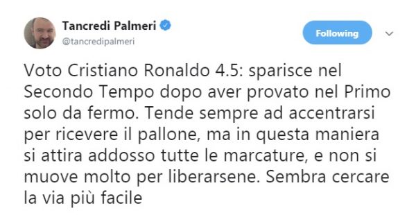 Almeno è questo il parere del giornalista di Bein Sport, Tancredi Palmeri, che su Twitter scrive: “Voto Cristiano Ronaldo 4.5: sparisce nel Secondo Tempo dopo aver provato nel Primo solo da fermo. Tende sempre ad accentrarsi per ricevere il pallone, ma in questa maniera si attira addosso tutte le marcature, e non si muove molto per liberarsene. Sembra cercare la via più facile“.