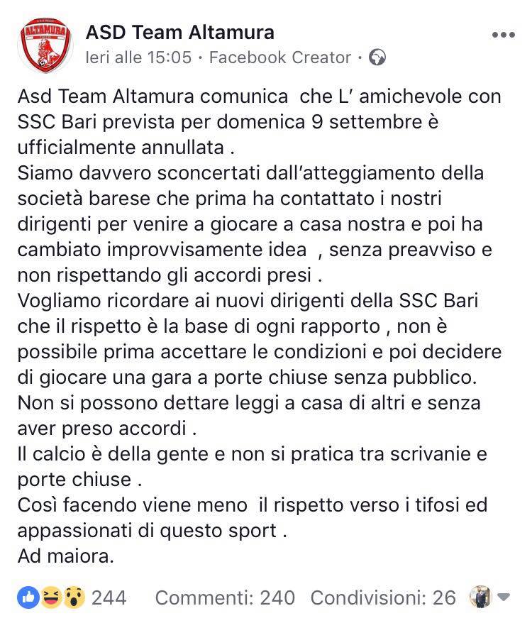 L’Altamura ha spiegato i motivi attraverso un lungo e dettagliato post sul proprio profilo Facebook ufficiale. Questo quanto si legge: “Siamo davvero sconcertati dall’atteggiamento della società barese che prima ha contattato i nostri dirigenti per venire a giocare a casa nostra e poi ha improvvisamente cambiato idea, senza preavviso e non rispettando gli accordi presi.