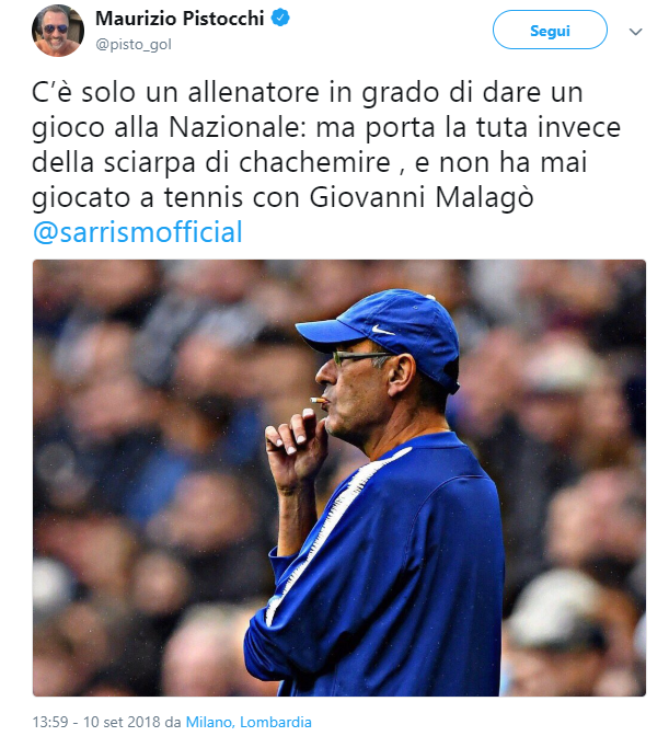 E a tal punto il giornalista Mediaset, Maurizio Pistocchi, ha voluto provocare su Twitter dando un consiglio su quello che, a suo avviso, sarebbe il tecnico perfetto per la Nazionale: Maurizio Sarri.