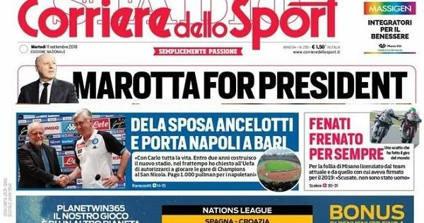 “Dela sposa Ancelotti e sposta il Napoli a Bari: con Carlo tutta la vita, entro due anni costruisco lo stadio. Nel frattempo ho chiesto alla Uefa di giocare la Champions al San Nicola, pago 1000 pullman per i napoletani“, questo è quanto si legge sulla prima pagina.