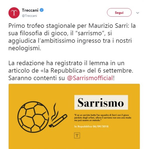 Sui social ha spopolato (e ancora spopola, ndr) un account a questo movimento dedicato, ma ora arriva l’ennesima gioia per Sarri. Infatti, a seguito di un articolo pubblicato su Repubblica lo scorso 6 settembre, in riferimento alla sconfitta del Napoli contro la Sampdoria allenata da un allievo di Sarri, Marco Giampaolo, la nota enciclopedia Treccani ha deciso che il termine “Sarrismo” diventerà a tutti gli effetti un neologismo. La decisione è stata annunciata dalla stessa Treccani con un post su Twitter.