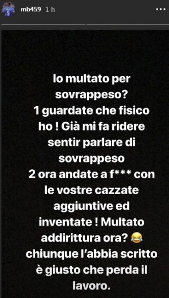La notizia è però stata smentita dallo stesso calciatore che due messaggi molto forti su Instagram. Nel primo messaggio non solo smentisce la multa con vari epiteti, ma soprattutto si augura che il giornalista che l’ha scritto perda al più presto il lavoro.