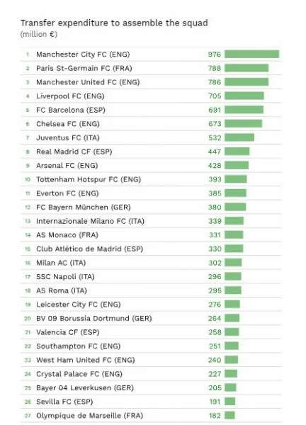 Ma esiste una speciale classifica, stilata dal CIES Football Observatory (Centro studi sul calcio europeo): questa funziona in base al valore della rosa attuale; o meglio, sono stati considerati i principali 5 campionati europei e sono stati analizzati i prezzi di acquisto dei singoli giocatori presenti attualmente nella società.