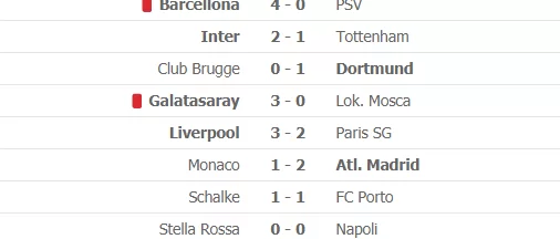 Nell’anticipo, ricco di emozioni il match fra l’Inter di Luciano Spalletti ed i londinesi del Tottenham, con le reti di Icardi e Vecino che hanno ribaltato un match nel più incredibile dei modi, all’ultimo respiro. Nessun problema per il Barcellona di Messi, autore di una tripletta ai danni del PSV. Spettacolare come da pronostico, il match fra Liverpool e Paris Saint Germain: decisiva una rete che sigla il 3-2 finale e regala 3 punti preziosissimi ai Reds.