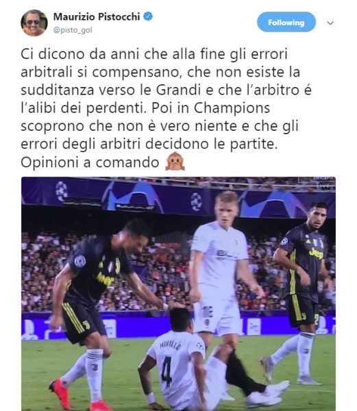 L’ultimo commento, particolarmente pungente contro l’ambiente bianconero, è stato pubblicato su Twitter dal giornalista di Mediaset, Maurizio Pistocchi: “Ci dicono da anni che alla fine gli errori arbitrali si compensano, che non esiste la sudditanza verso le Grandi e che l’arbitro é l’alibi dei perdenti. Poi in Champions scoprono che non è vero niente e che gli errori degli arbitri decidono le partite. Opinioni a comando 🙊“.