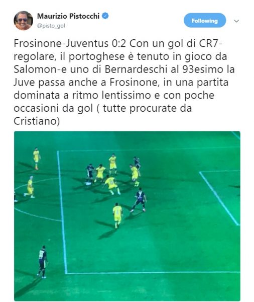 Il commento di Pistocchi: “Frosinone-Juventus 0:2 Con un gol di CR7-regolare, il portoghese è tenuto in gioco da Salomon-e uno di Bernardeschi al 93esimo la Juve passa anche a Frosinone, in una partita dominata a ritmo lentissimo e con poche occasioni da gol ( tutte procurate da Cristiano)“.