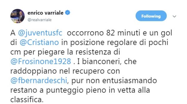 Varriale: “A @juventusfc occorrono 82 minuti e un gol di @Cristiano in posizione regolare di pochi cm per piegare la resistenza di @Frosinone1928 . I bianconeri, che raddoppiano nel recupero con @fbernardeschi, pur non entusiasmando restano a punteggio pieno in vetta alla classifica“.