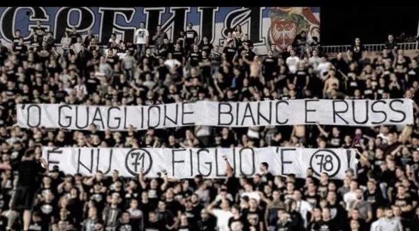Ieri durante il Veciti Derbi, ovvero il derby di calcio tra Partizan Belgrado e Stella Rossa (gara finita 1-1, ndr), i tifosi del Partizan – come riferisce la pagina ‘La Napoli Bene’ su Facebook – hanno esposto due striscioni scritti in napoletano.
