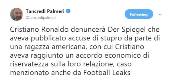 AGGIORNAMENTO ORE 22.35 – Come riferisce su Twitter il giornalista di Bein Sport, Tancredi Palmeri, Cristiano Ronaldo ha intenzione di denunciare il quotidiano Der Spiegel, respingendo così ogni accusa nei suoi confronti.