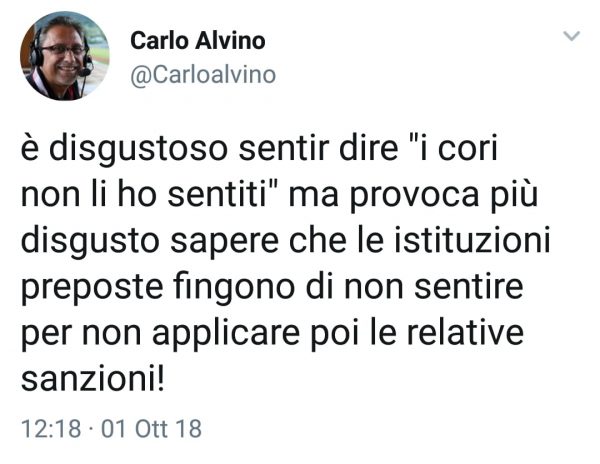 “È disgustoso sentir dire “i cori non li ho sentiti” ma provoca più disgusto sapere che le istituzioni preposte fingono di non sentire per non applicare poi le relative sanzioni!”
