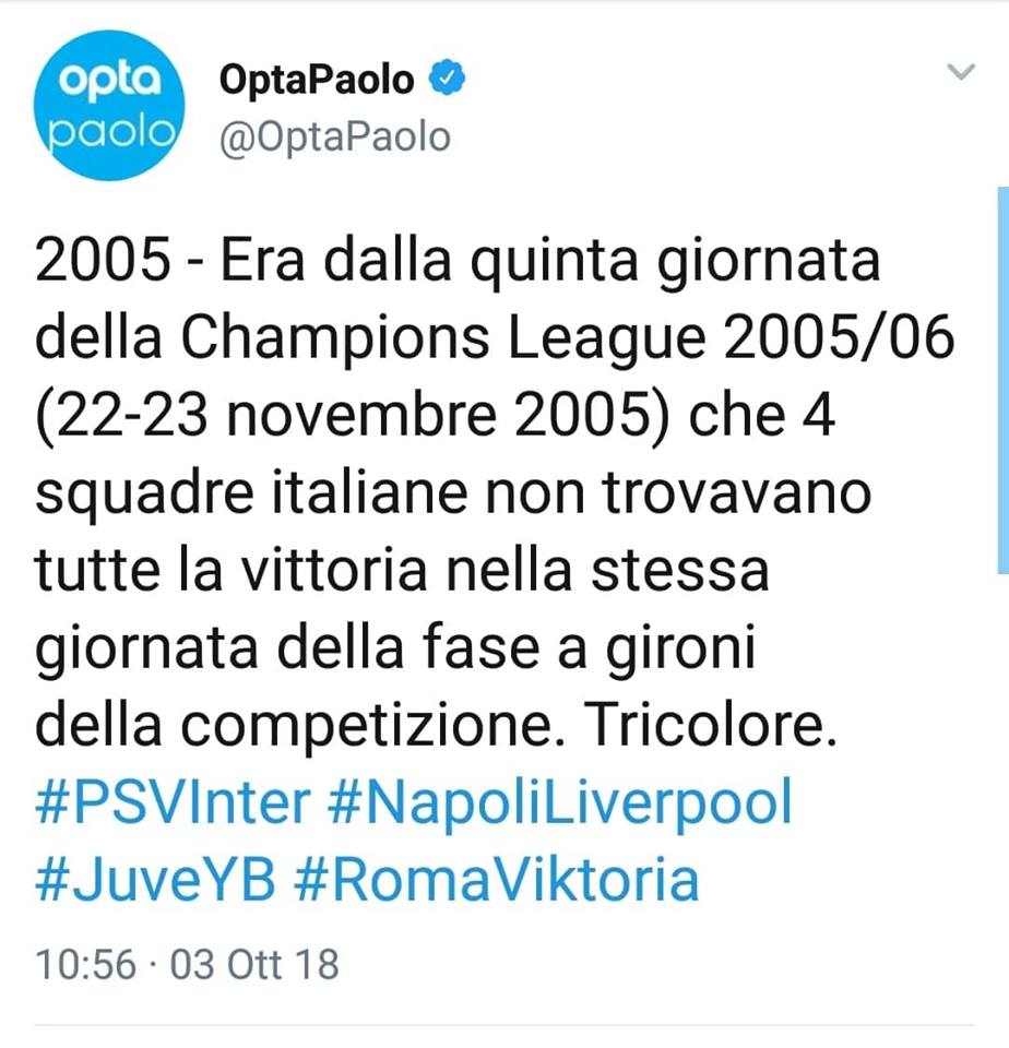 Era praticamente da tredici anni, dalla stagione 2004-2005, che quattro squadre italiane non vincevano contemporaneamente tutte e quattro. Nella due giorni di Champions, infatti, hanno trionfato Juve, Roma, Inter e infine il Napoli, con la bellissima vittoria contro il Liverpool.
