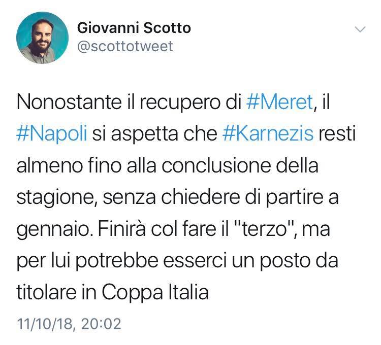 Giovanni Scotto, collega de ‘Il Roma’, ha dato importanti aggiornamenti per quel che riguarda Orestis Karnezis, portiere del Napoli che, col ritorno di Alex Meret, potrebbe vedersi ridotte ancor di più le chance di giocare in maglia azzurra.