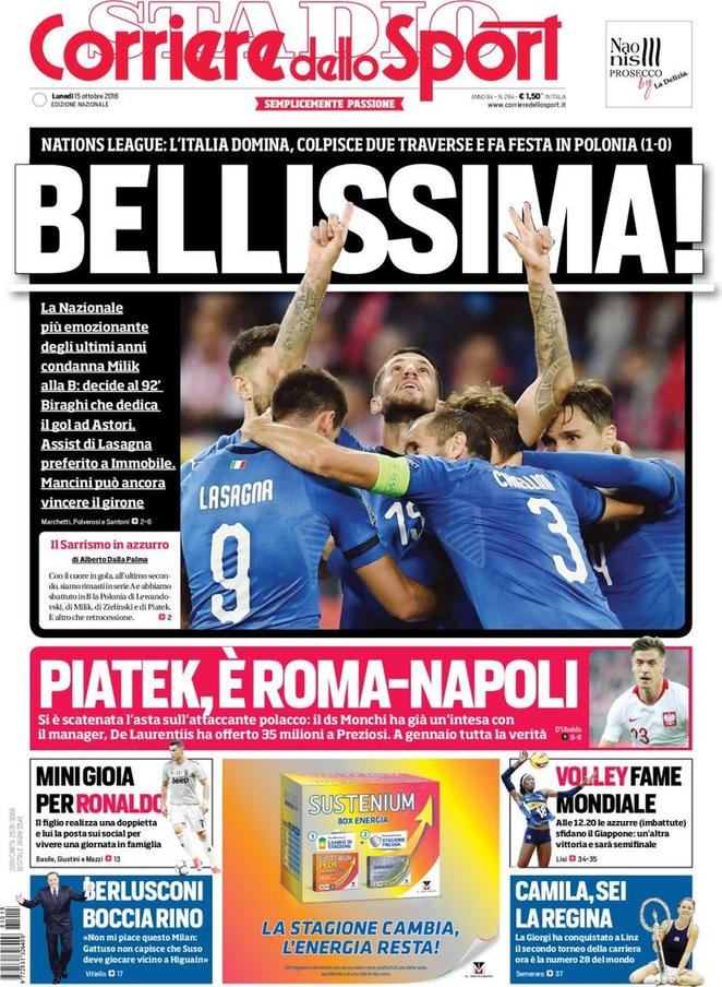 Prima pagina dedicata, come prevedibile, alla Nazionale. Il Corriere dello Sport, in edicola questa mattina, esordisce con un “Bellissima!” in copertina, per sottolineare la splendida prestazione dell’Italia contro la Polonia. Eppure anche il mercato trova spazio sulle colonne del giornale.