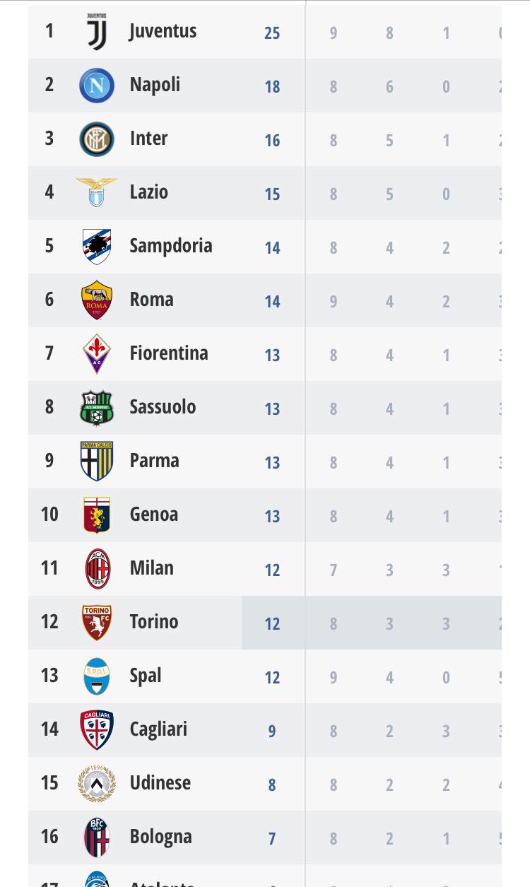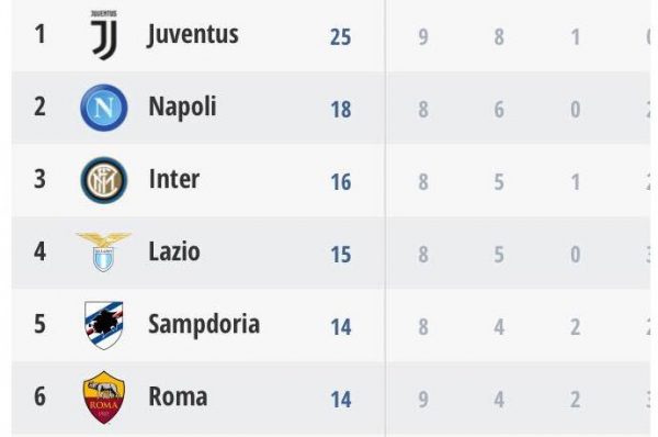 Nel pomeriggio la sconfitta della Roma contro la Spal tiene i giallorossi bloccati a quota 14 punti in classifica, mentre i bianconeri dopo il pareggio col Genoa salgono a 25 punti. Ecco la classifica: