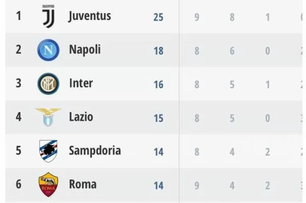 Nel pomeriggio la sconfitta della Roma contro la Spal tiene i giallorossi bloccati a quota 14 punti in classifica, mentre i bianconeri dopo il pareggio col Genoa salgono a 25 punti. Ecco la classifica:
