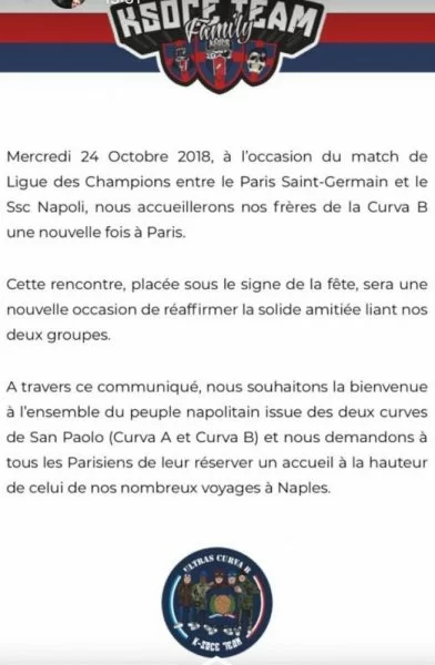 Attraverso questo comunicato, diamo il benvenuto a tutto il popolo napoletano, oltre alle due curve del San Paolo (Curva A e Curva B) e chiediamo a tutti i parigini di dare loro un benvenuto all’altezza dei nostri numerosi viaggi a Napoli”.