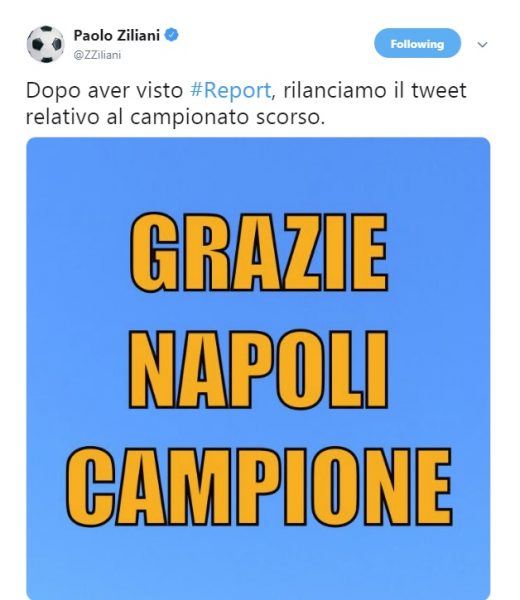 L’inchiesta di Report su Rai 3 ha scatenato tantissimi commenti sul web. Tra questi spicca quello del giornalista Paolo Ziliani che su Twitter ha rilanciato un messaggio dello scorso anno inneggiante il Napoli.