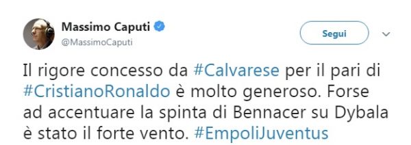 Il giornalista Massimo Caputi su Twitter non risparmia un commento particolarmente sarcastico al penalty assegnato ai bianconeri: “Il rigore concesso da #Calvarese per il pari di #CristianoRonaldo è molto generoso. Forse ad accentuare la spinta di Bennacer su Dybala è stato il forte vento. #EmpoliJuventus”.