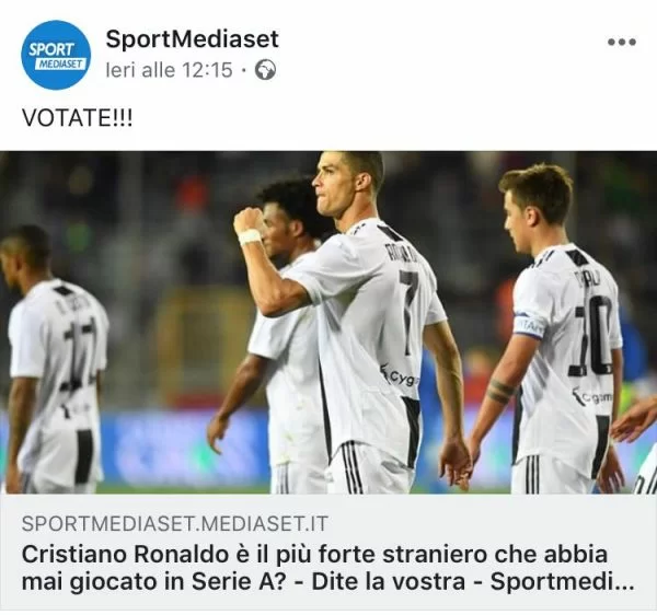 Idolatrato fin dal suo arrivo in Italia, anche troppo. Infatti un particolare sondaggio, pubblicato dalla redazione di Sportmediaset, sta facendo discutere sul web. Già, perché i colleghi si sono chiesti se CR7 fosse il miglior calciatore straniero ad aver giocato in Serie A. Domanda leggermente fuori luogo, se pensiamo ai grandi campioni del passato, quali Paltini, Van Basten, Zico e il più grande di tutti, Diego Armando Maradona.