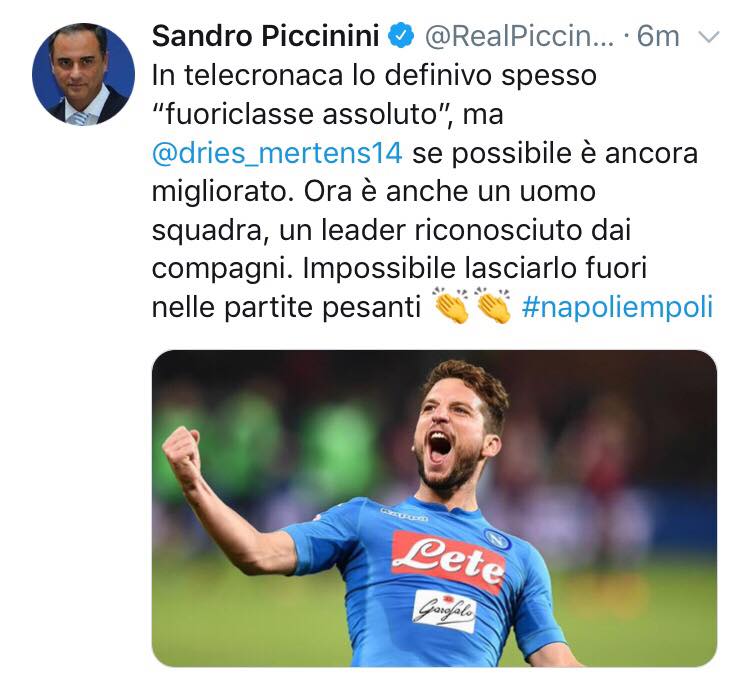 Sandro Piccinini, noto giornalista italiano, ha commentato così su twitter la grandissima partita dell’asse belga: “In telecronaca lo definivo un fuoriclasse assoluto, ma Dries Mertens se possibile è ancora migliorato. Ora è anche un uomo squadra, un leader riconosciuto dai compagni. Impossibile lasciarlo fuori nelle partite pesanti”.