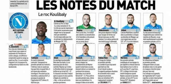 Fanno ancor più discutere le pagelle che si possono leggere tra le pagine del prestigioso quotidiano francese, con una sfilza di 4 ai giocatori del Napoli, compreso il tecnico Carlo Ancelotti. Addirittura 3 il voto ad Albiol, mentre viene elogiata la prestazione di Koulibaly che si guadagna un meritato 8. La sensazione è che in Francia non fossero preparati: evidentemente avevano sottovalutato fin troppo il Napoli. Il risultato è che non tutti hanno saputo accettare che dal doppio confronto con gli azzurri, almeno ai punti, il Psg ne sia uscito sconfitto.