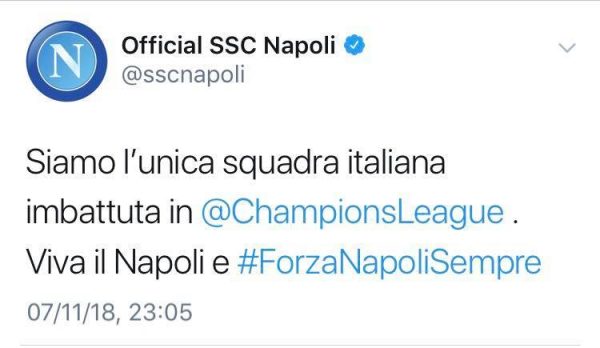 Le sue parole: “Il tweet conferma la povertà intellettuale e la provincialità della società azzurra. Un messaggio così non ha alcun senso: forse credono di aver vinto la Champions. O di aver passato già il girone. È un qualcosa di ridicolo”.