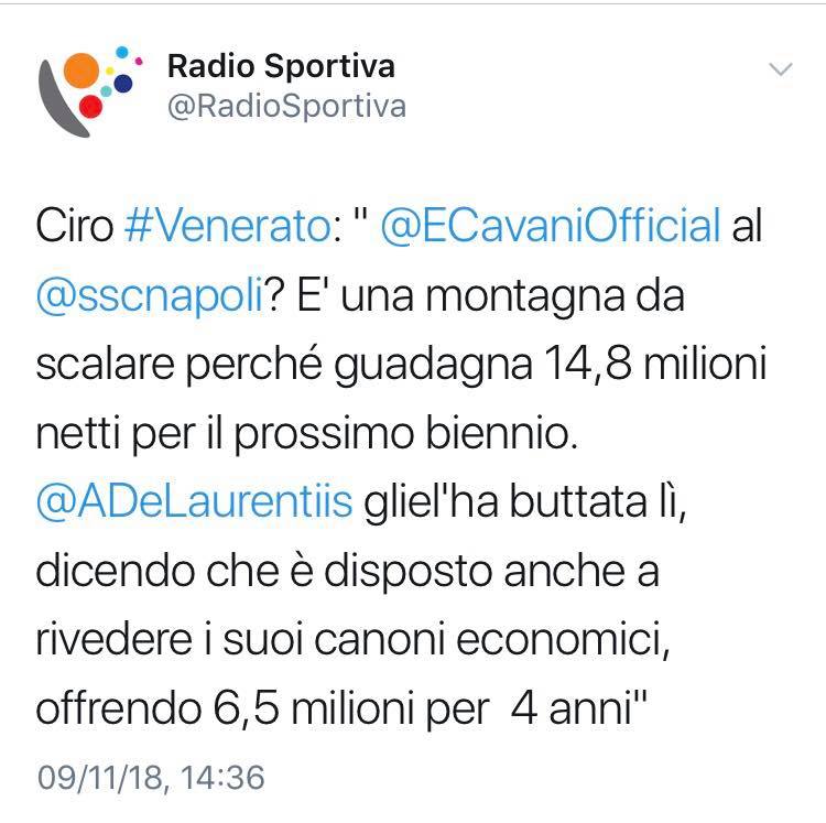 Stando a quanto dichiarato da Venerato, De Laurentiis avrebbe già lanciato la sua proposta a Cavani, tralasciando anche i canoni che solitamente il club azzurro rispetta: per il Matador De Laurentiis sarebbe disposto ad offrire 6.5 milioni per 4 anni.