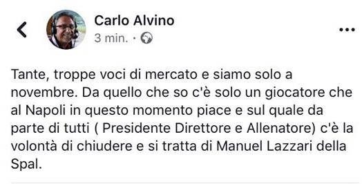 “Tante, troppe voci di mercato e siamo solo a novembre. Da quello che so c’è un solo giocatore che al Napoli in questo momento piace e sul quale da parte di tutti (Presidente, Direttore ed Allenatore) c’è la volontà di chiudere e si tratta di Manuel Lazzari della Spal“.